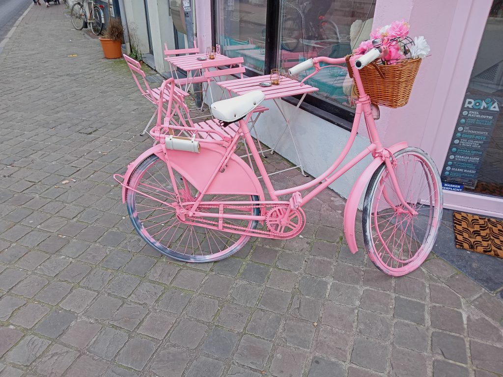Bicicleta rosada (medio de transporte muy utilizado en la ciudad) que sirve como decoración de una de las muchas cafeterías que alberga la ciudad.