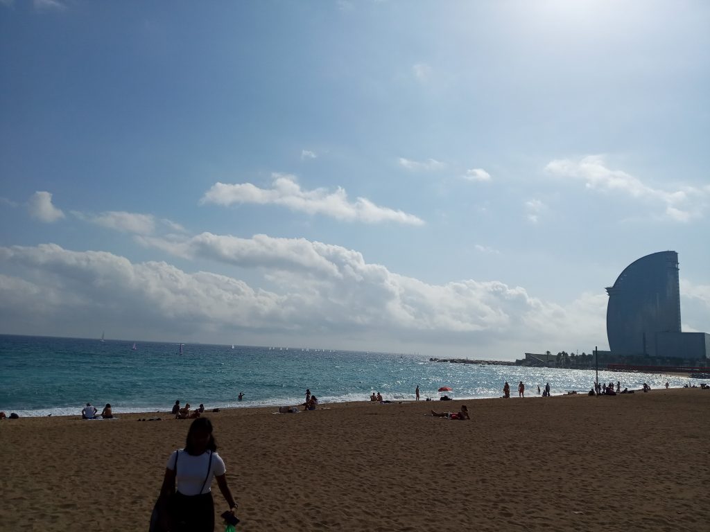 Playa con el hotel W Barcelona, es un edificio que alcanza una altura de 98,8 m. Fue diseñado por el arquitecto español Ricardo Bofill, este edificio se enmarca dentro de la ampliación de la zona sur del puerto de Barcelona.