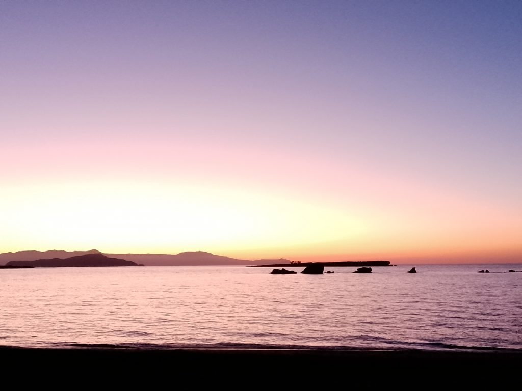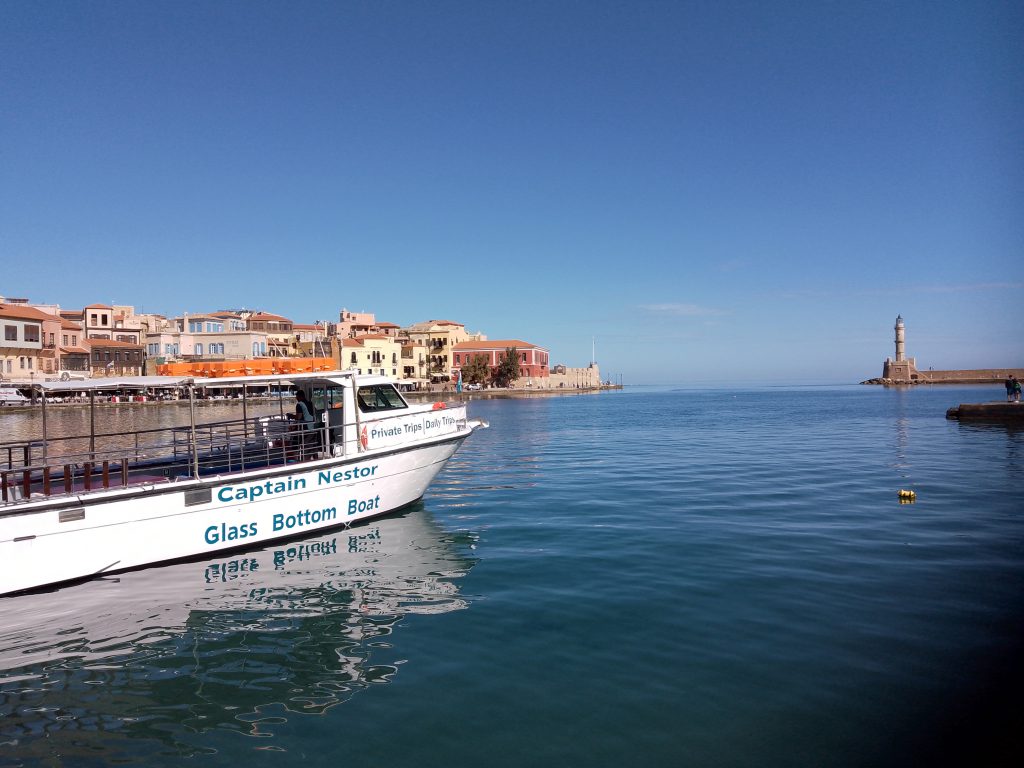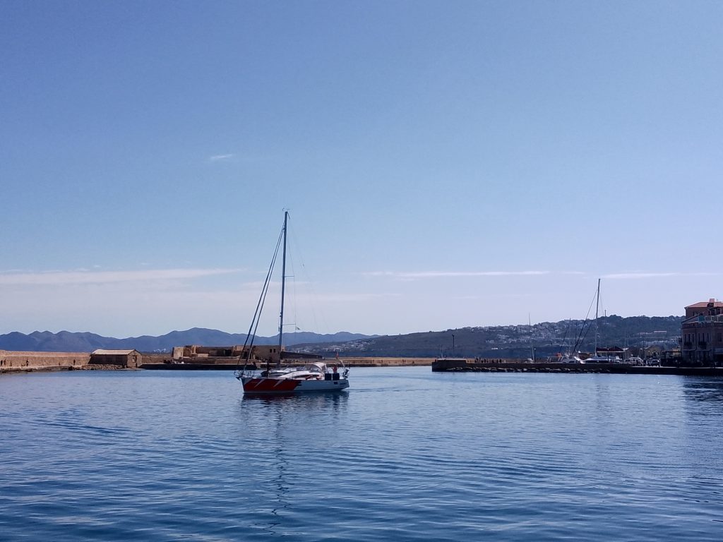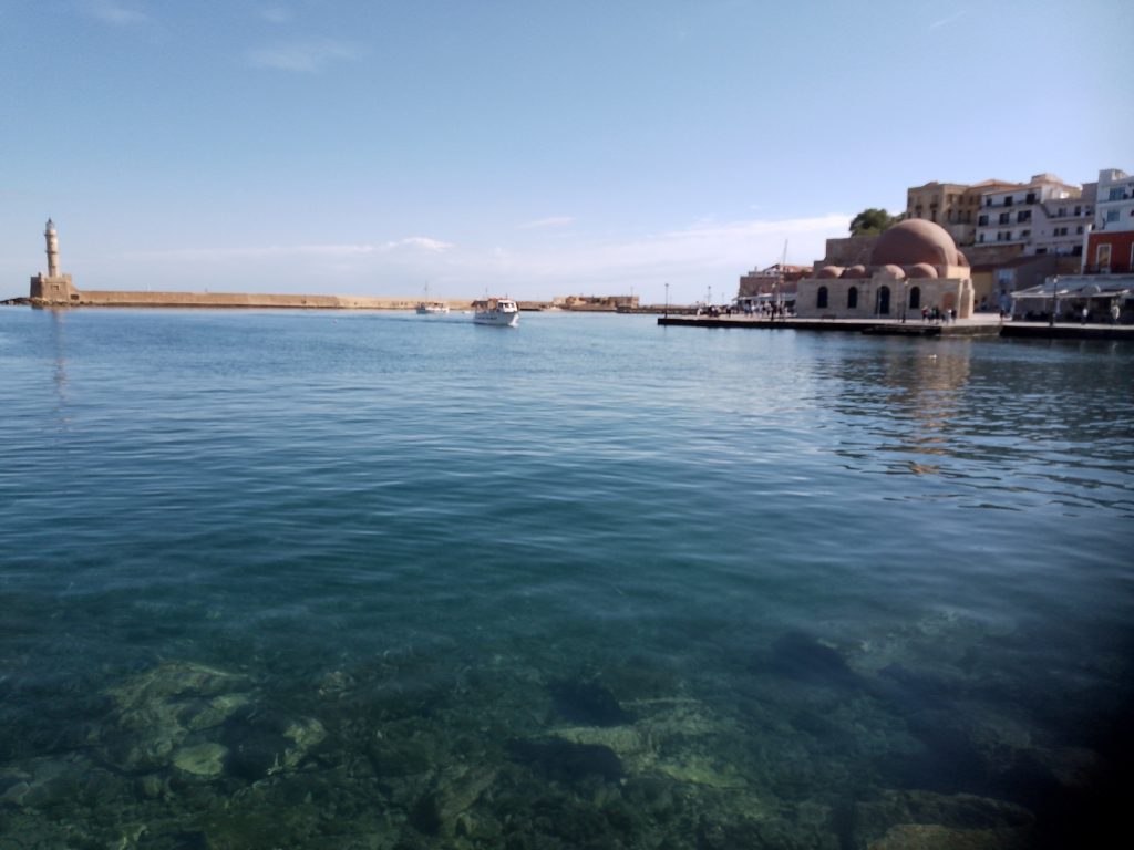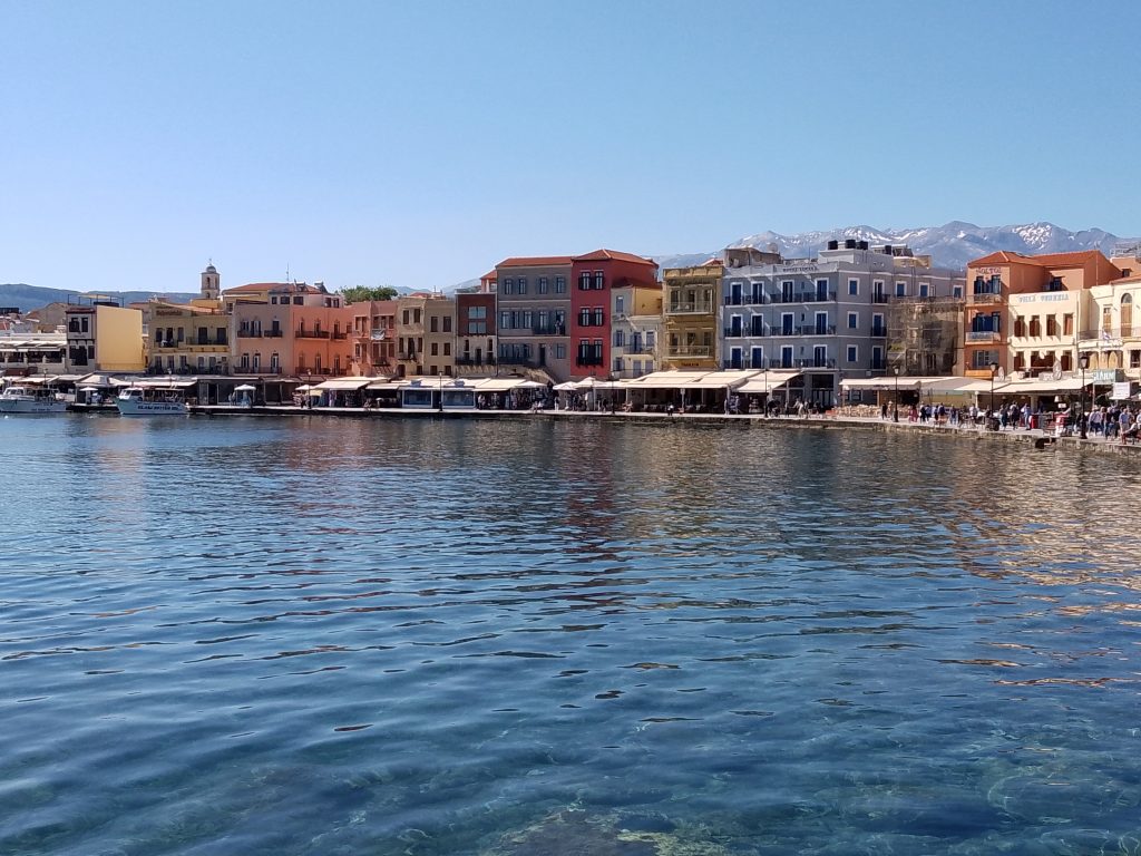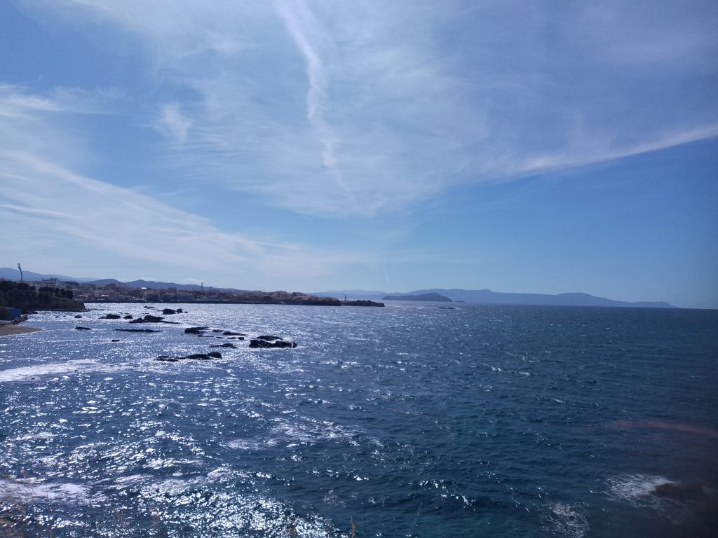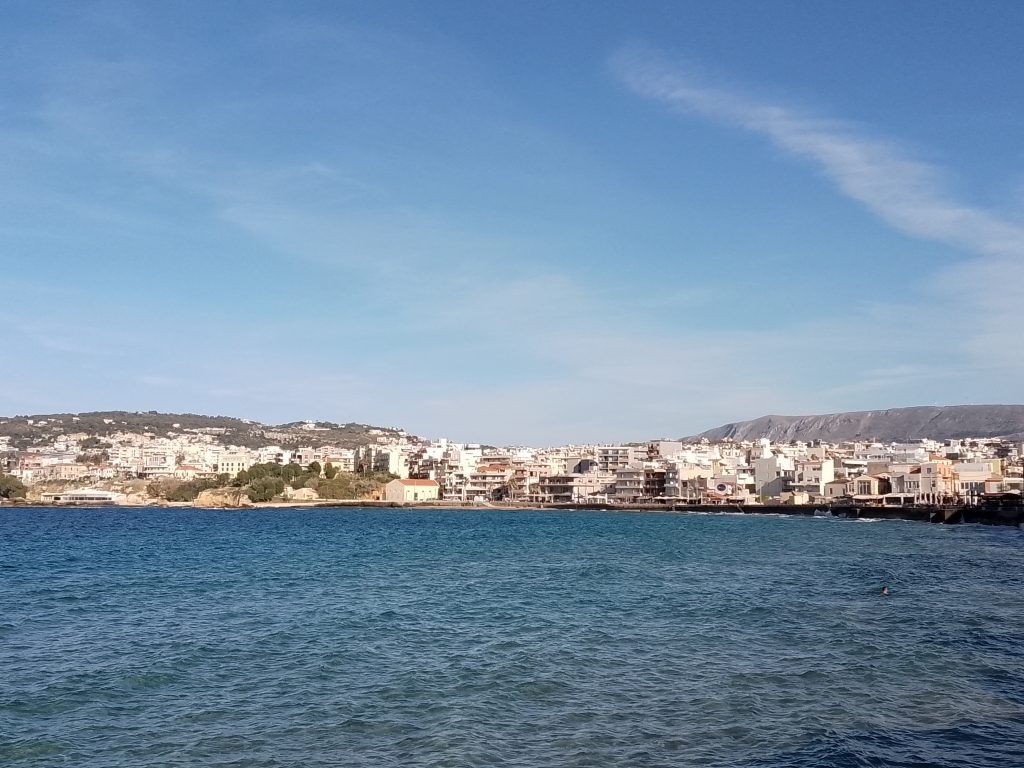 Panorámica del mar Egeo y al fondo la ciudad de Chania.