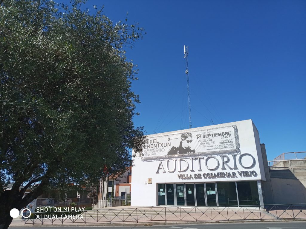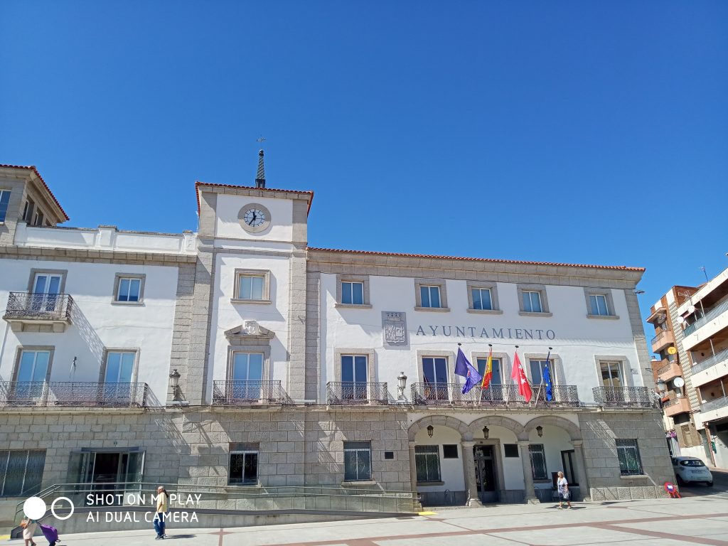 Edificio del Ayuntamiento de Colmenar Viejo sobrio, castellano, mezclando tonos blancos con grises y presidiendo la plaza dedicada al pueblo. dos torres frontales rematadas, con balconada central y con corte clásico: dinteles y líneas rectas. Desde una perspectiva estética muy equilibrado y en concordancia con el pueblo en general.