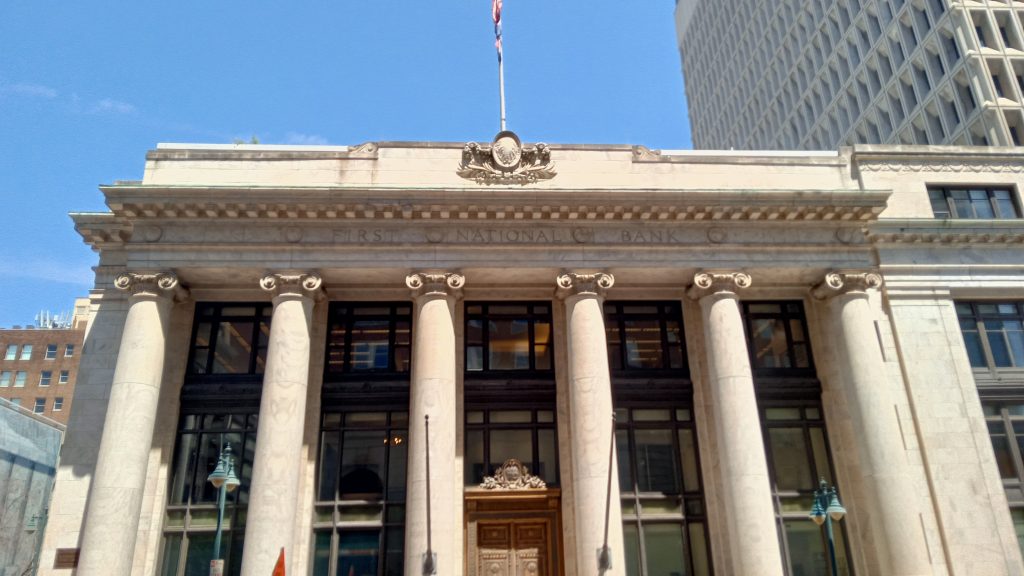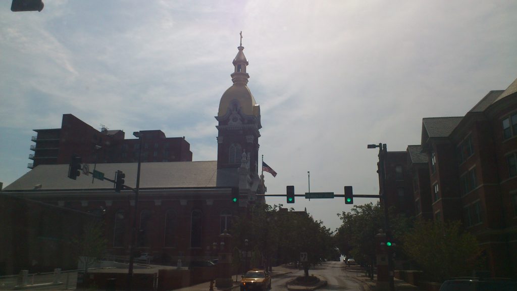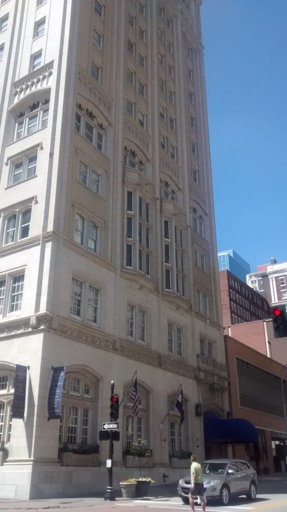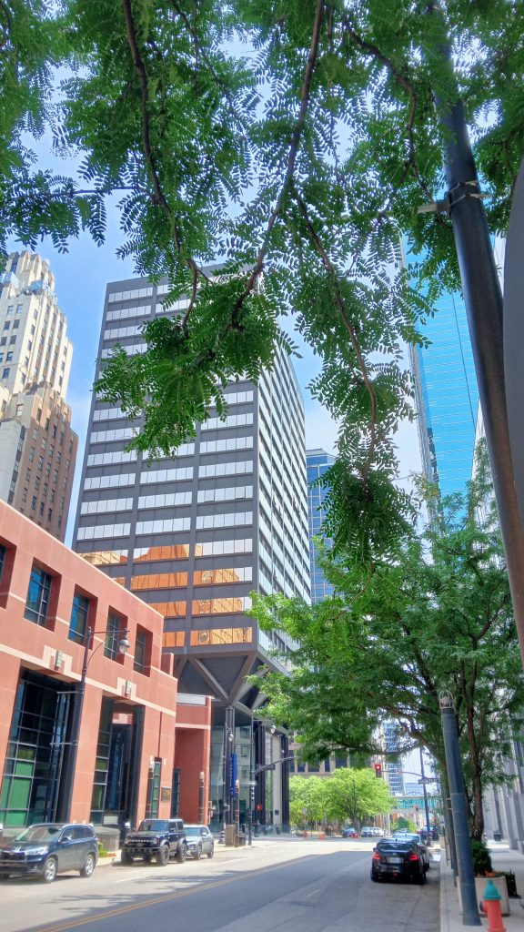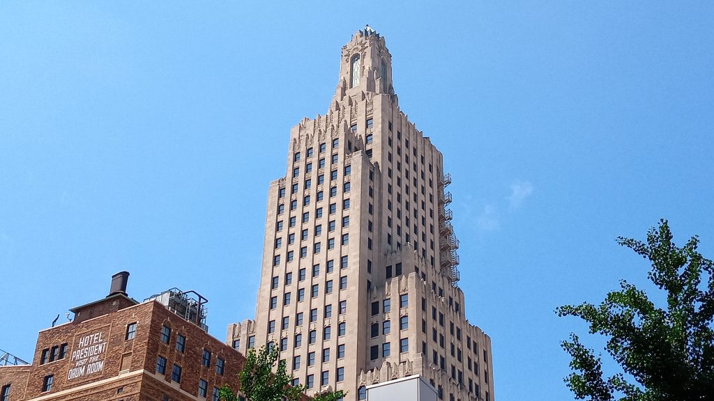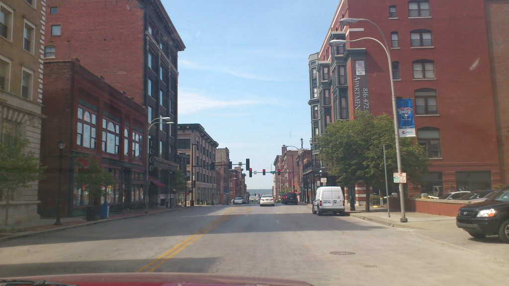 Edificio céntrico de Kansas City, no hay peatones caminando por las calles, la mayoría de la población se desplaza en vehículos.