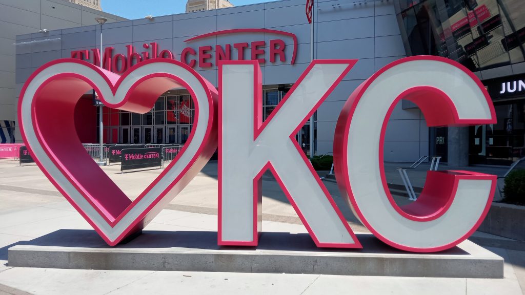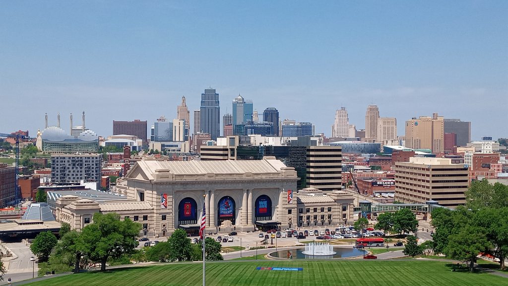 Hotel céntrico de Kansas City adornado con la bandera estatal y local.