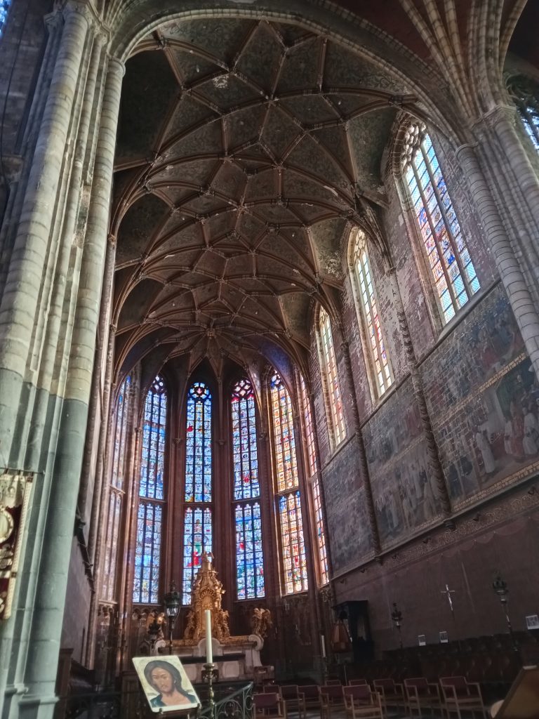 Se construyó en el siglo XIII (a partir de 1240, el actual coro, el trasepto, la nave central y las naves laterales actuales, en estilo gótico primitivo. Los tres ábsides poligonales de naves y capillas fueron construidos en el siglo XIV. Los ábsides son de estilo gótico flamígero, mientras que los claristorios, las capillas laterales y el campanario son de estilo gótico tardío. La torre fue construida hacia 1390; originalmente fue cubierta por un campanario de madera. El claustro fue reconstruido entre 1445 y 1550. A lo largo del siglo XVI se finalizaron los elementos de decoración interior, incluyendo vidrieras, pinturas morales y dibujos en las bóvedas.
