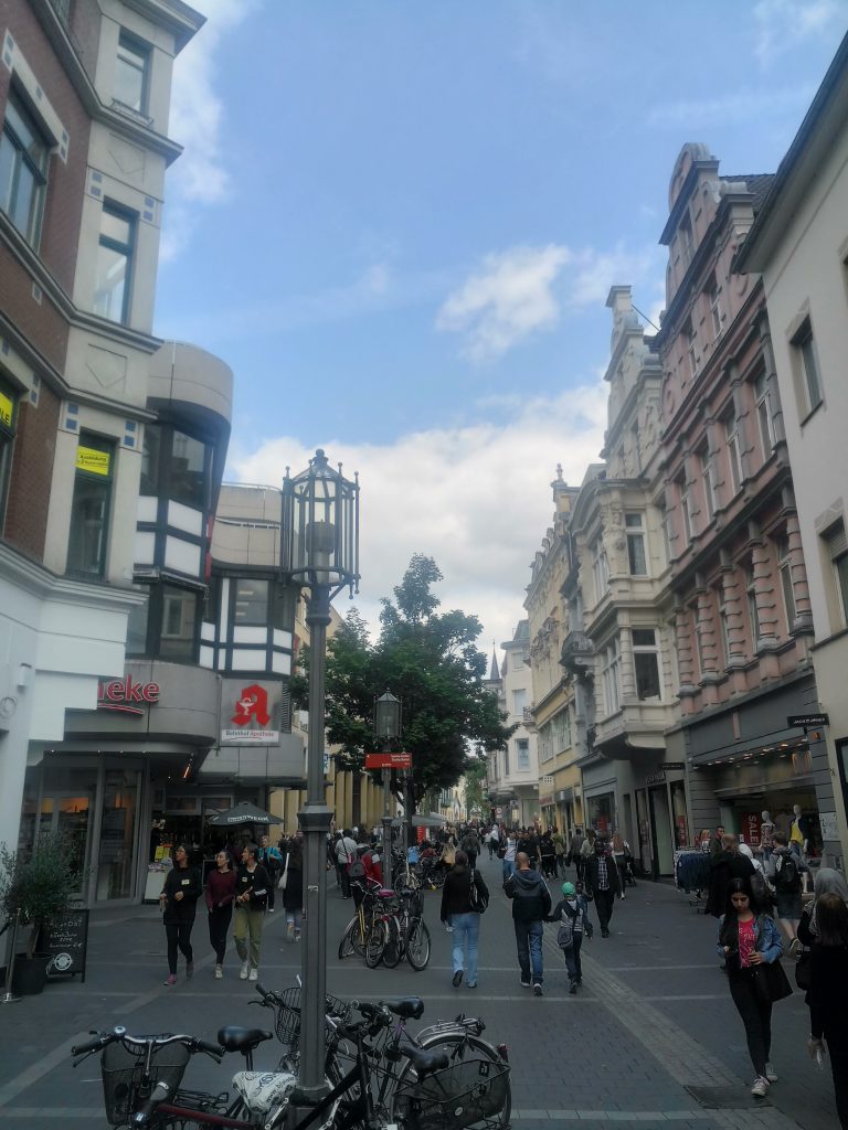 Calle peatonal comercial llena de comercios, restaurantes, etc..
