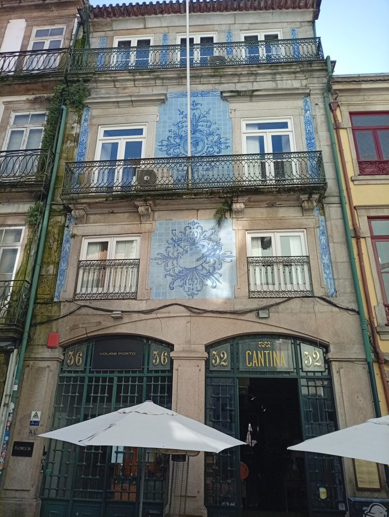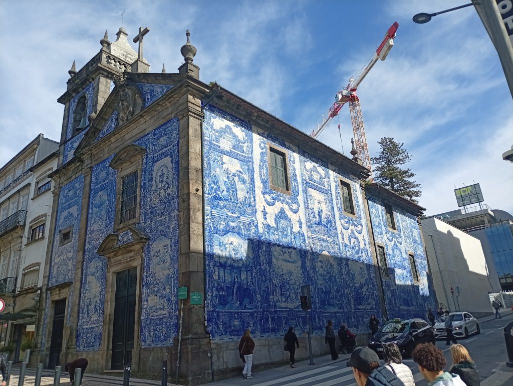 Precioso edificio con azulejos azules, una tónica que se visualiza por donde la ciudad.