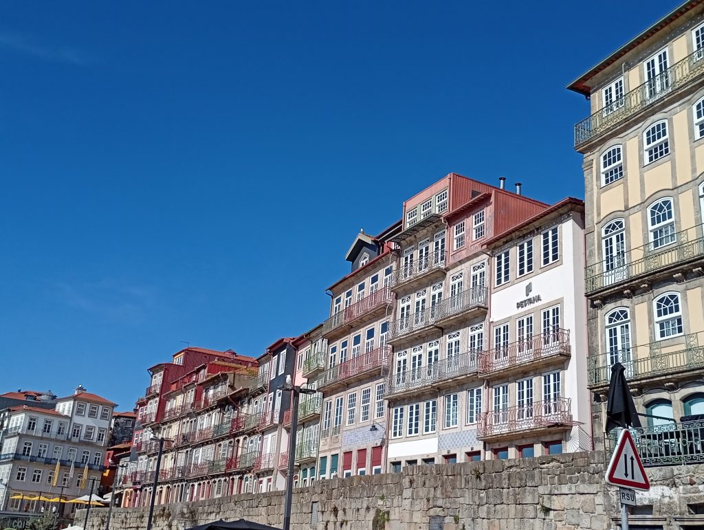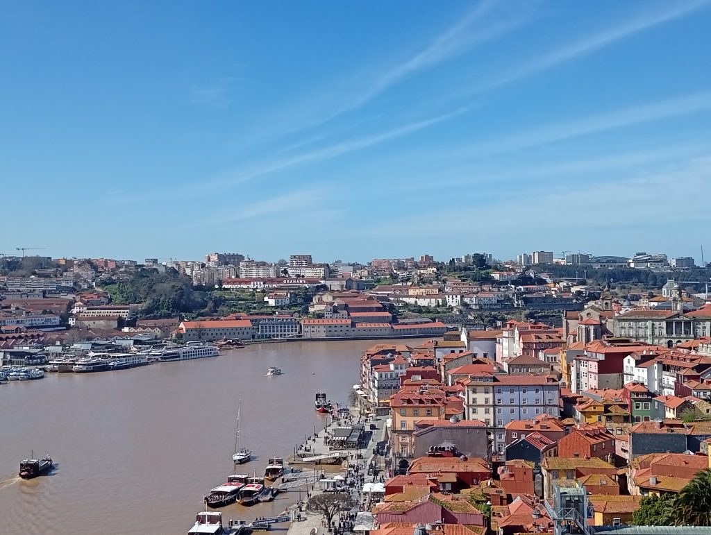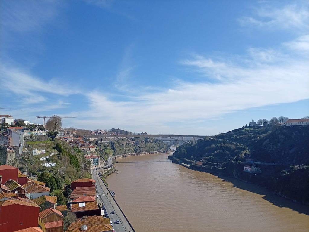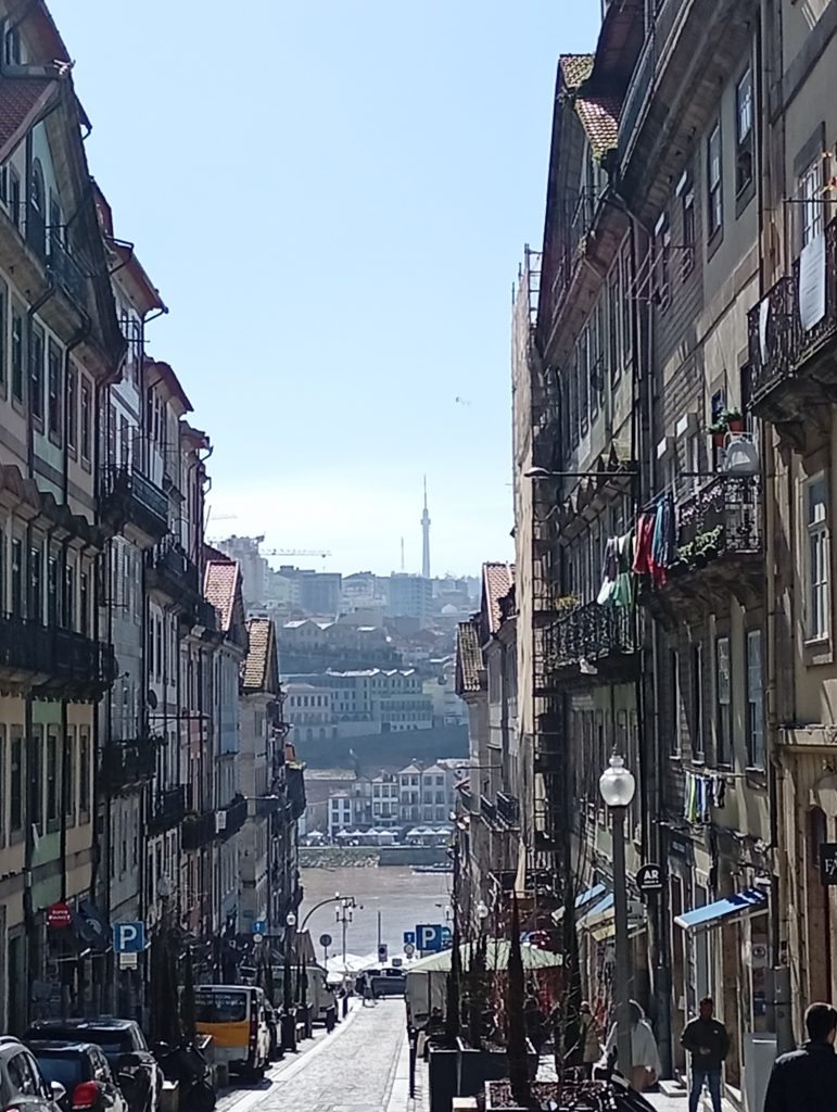 Vista del río Duero desde una de las calles empinadas que desembocan en el río. Oporto se erige en calles inclinadas repletas de comercios y en donde deleitarse con sus calles, establecimientos y edificios pintorescos.