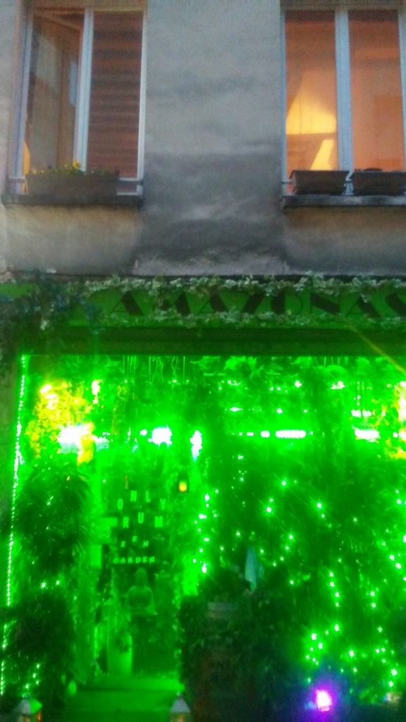 Bar iluminado de noche (Amazonas) en el barrio de Le Marais.