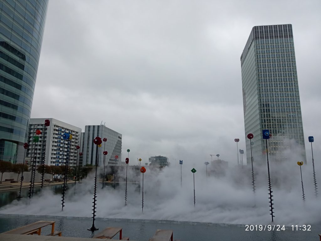 Fuente en La Défense, es un moderno barrio de negocios situado al oeste de París, como prolongación del “axe historique” (eje histórico) que comienza en el Louvre y prosigue por la Plaza de la Concordia, la avenida de los Campos Elíseos, el Arco de Triunfo, y hasta el puente de Neuilly y el Arco de La Défense o Grande Arche.