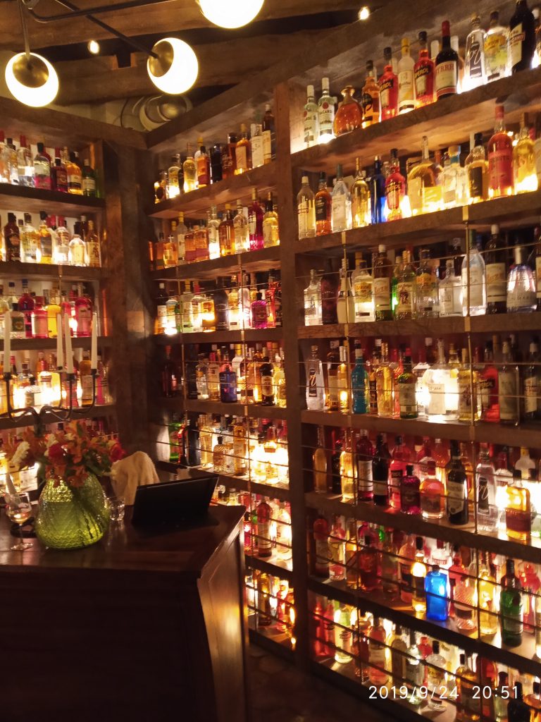 Restaurante con la entrada llena de botellas de colores de vidrio.