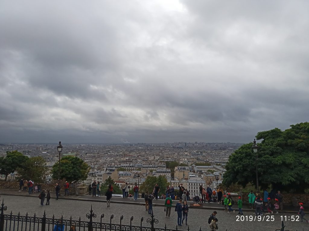 Vista panorámica de la ciudad de París desde la colina Montmartre de 130 metros de altura situada en la orilla derecha del río Sena, en el XVIII Distrito de París, principalmente conocida por la cúpula blanca de la Basílica del Sacré Cœur (en español «sagrado corazón»), ubicada en su cumbre. Cerca, otra iglesia, la más antigua de la colina es Saint Pierre de Montmartre, fundada por la reina de Francia en el siglo XII.