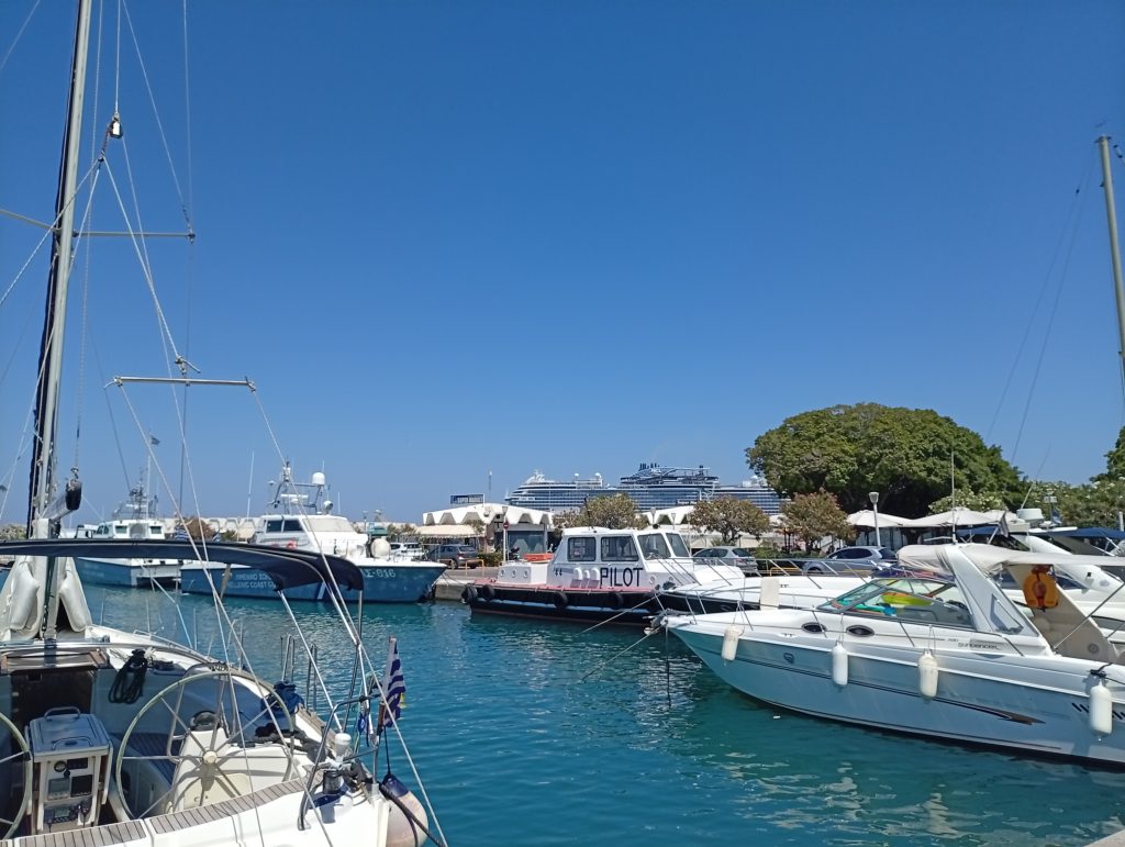 Vista panorámica de diferentes yates amarrados en el puerto deportivo de la ciudad de Rodas.
