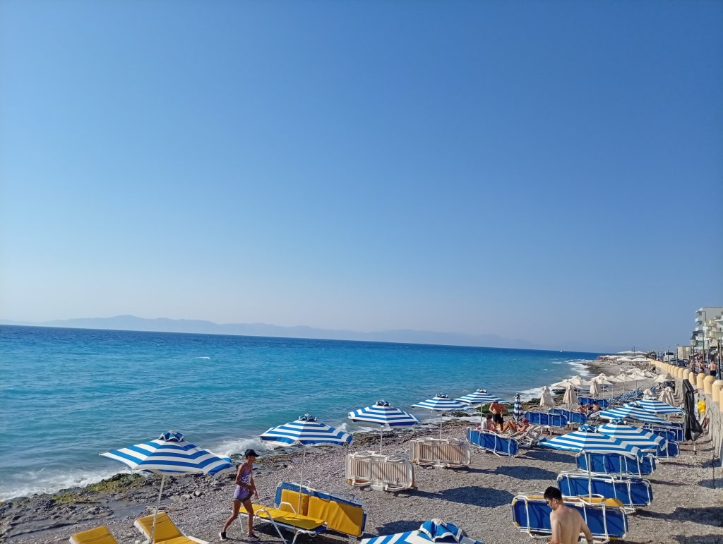 Bonita playa repleta de sombrillas para aliviar el calor sofocante del verano de Rodas con los colores de la bandera de Grecia.