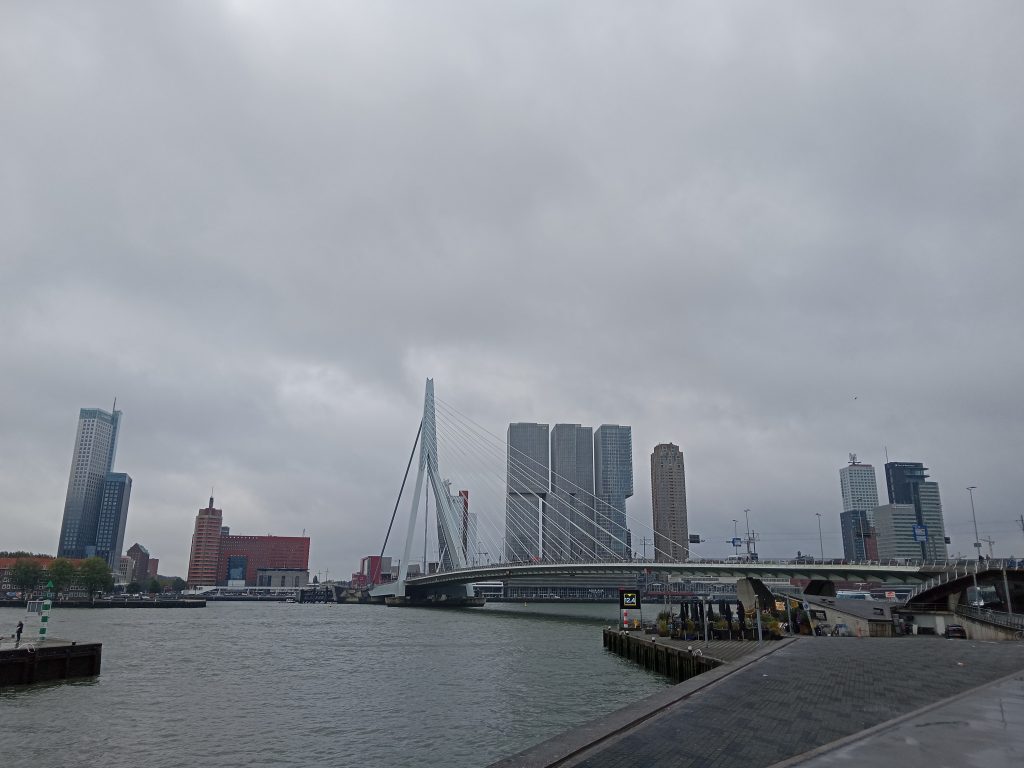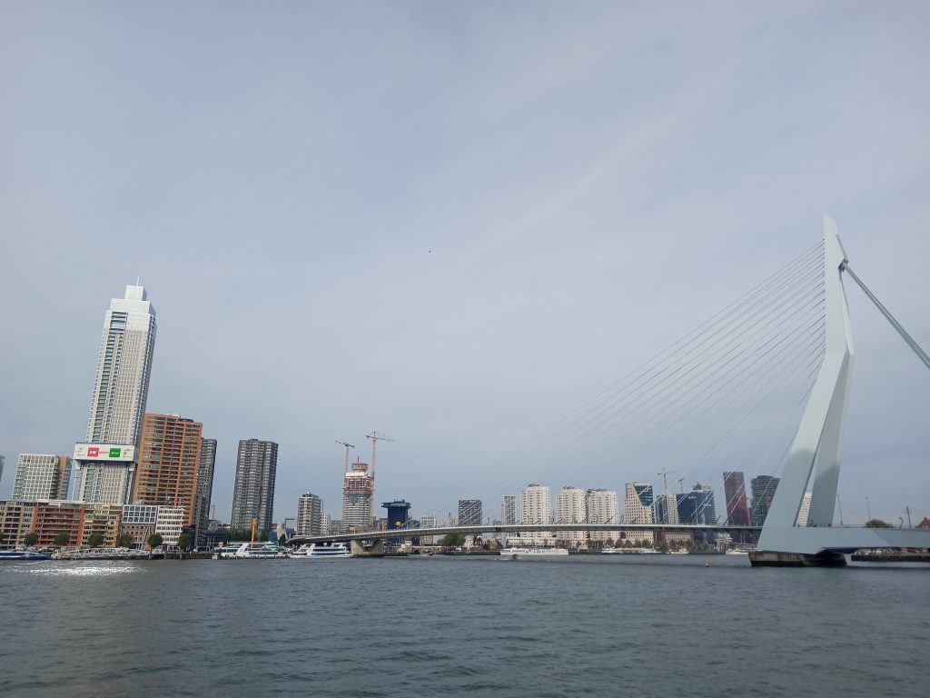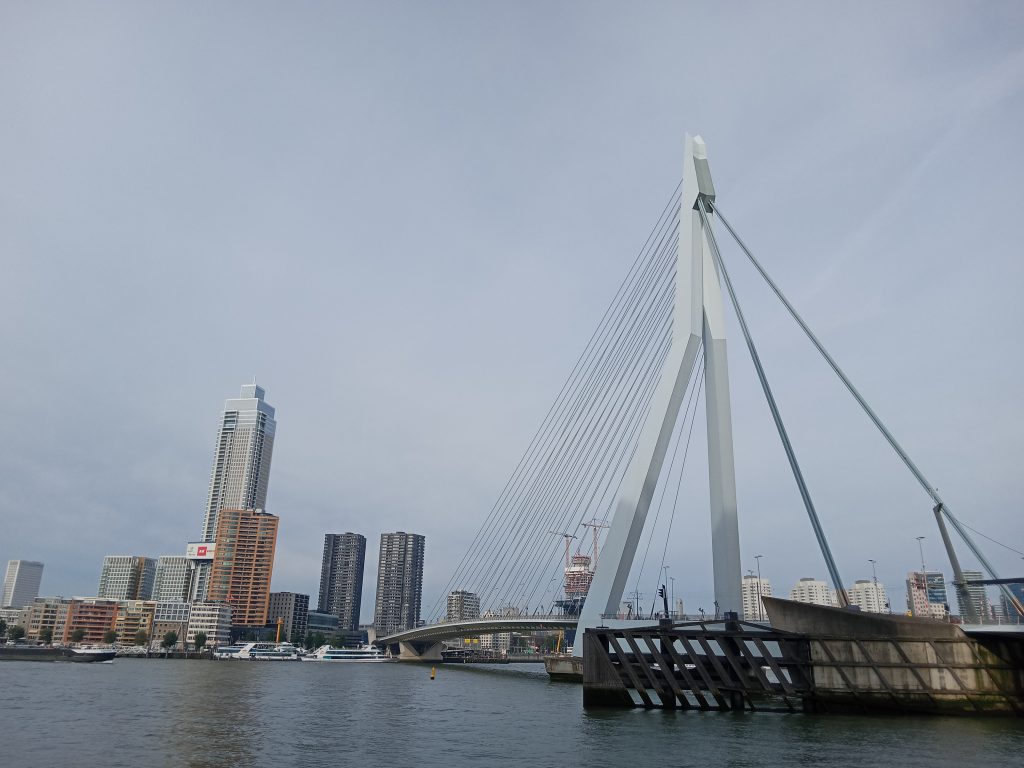 El Erasmusbrug (Puente de Erasmo) es un puente atirantado que cruza el Nieuwe Maas, conectando las zonas norte y sur de Rotterdam. Fue diseñado por Ben van Berkel y Caroline Bos (UNstudio) y completado en 1996. El puente tiene 802 m de longitud y un pilón asimétrico de 139 m de altura que le valió su apodo de De Zwaan (‘El Cisne’).