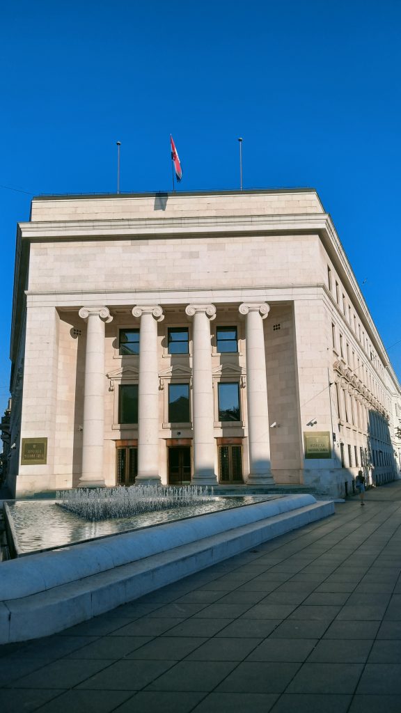 Edificio del Banco Nacional que fue creado en 1990 por la Constitución de Croacia y, en 1993, se convirtió en un organismo autónomo del estilo de la mayoría de los países occidentales. Se rige por la Ley de Bancos de 2002, que fortaleció sus capacidades de supervisión e inspección, y rinde a su vez cuentas ante el Parlamento de Croacia,